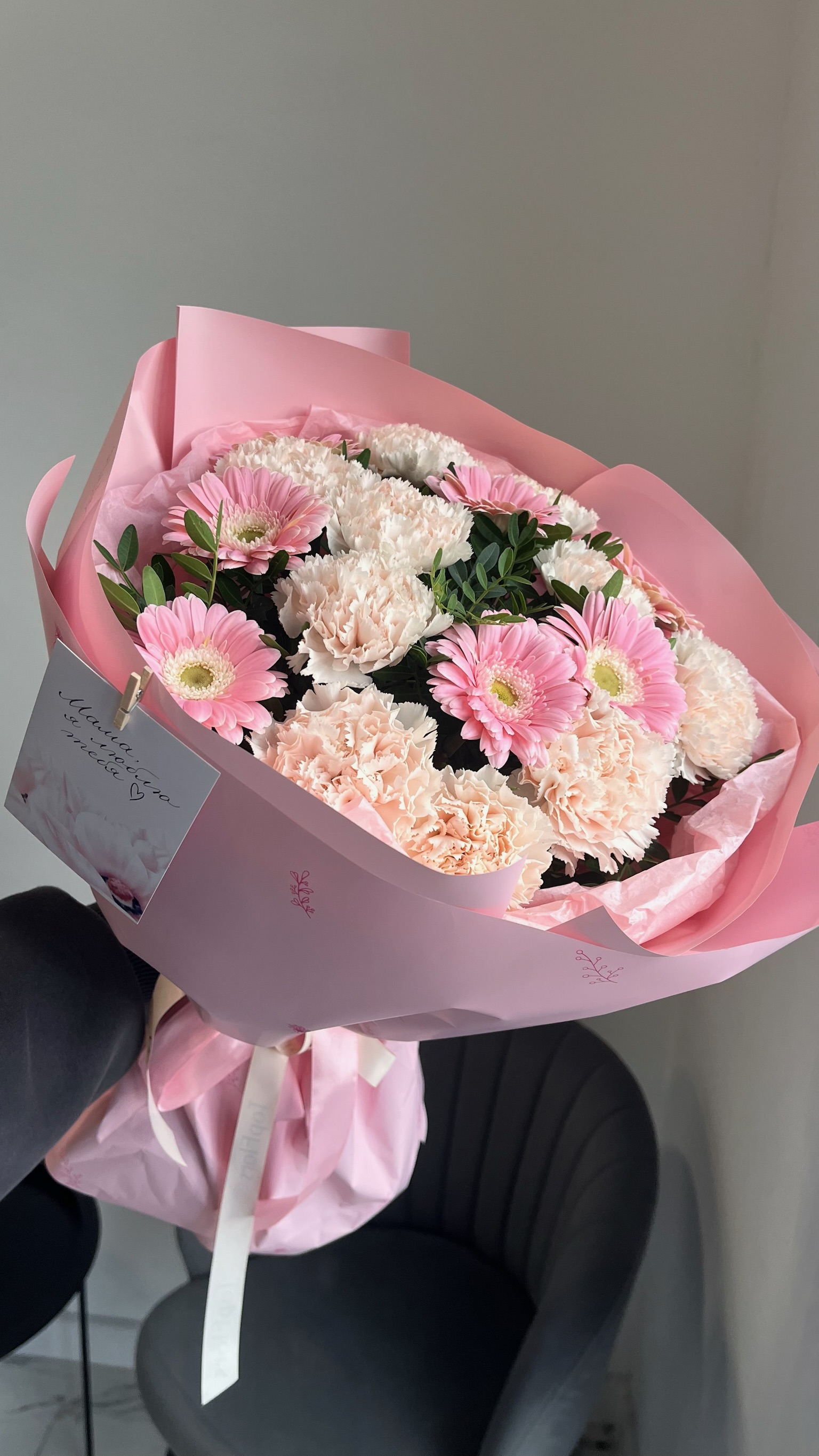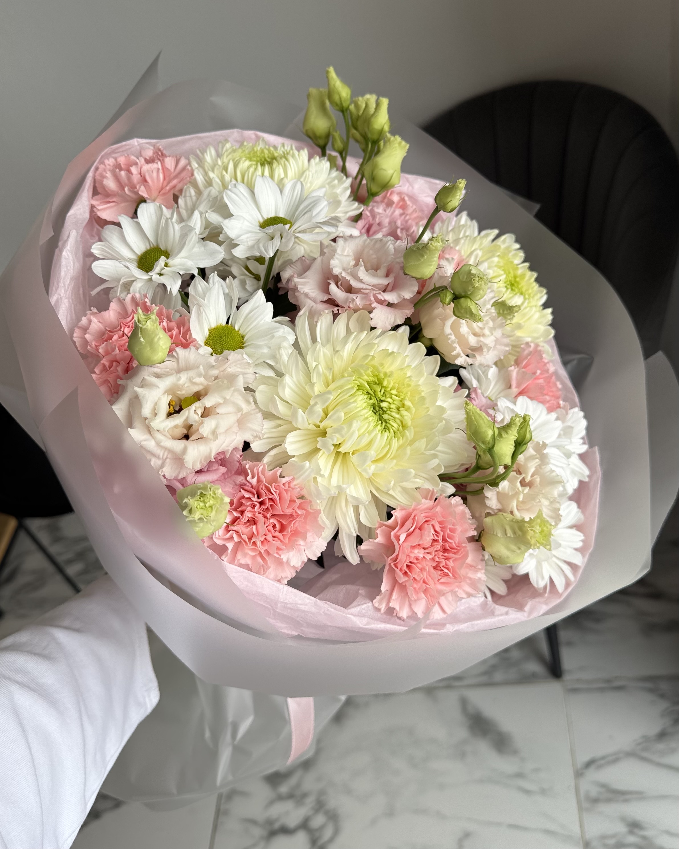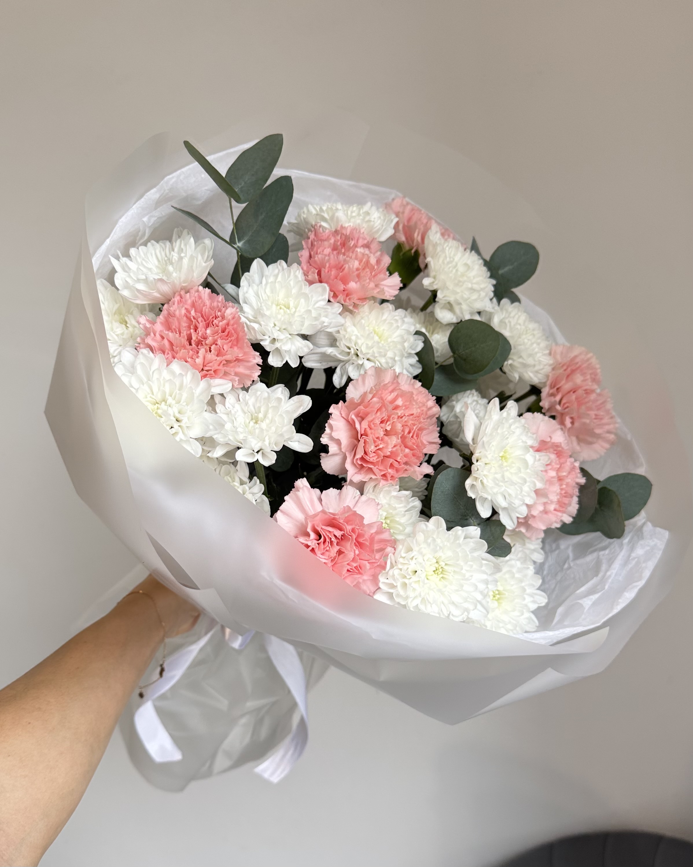 Этот букет - словно дыхание свежести и чистоты. Пышные белые кустовые хризантемы напоминают облака, сотканные из нежности, а изящные диантусы добавляют тонкие акварельные штрихи. Вместе они создают гармонию простоты и изысканности, говоря без слов о трепетном внимании.