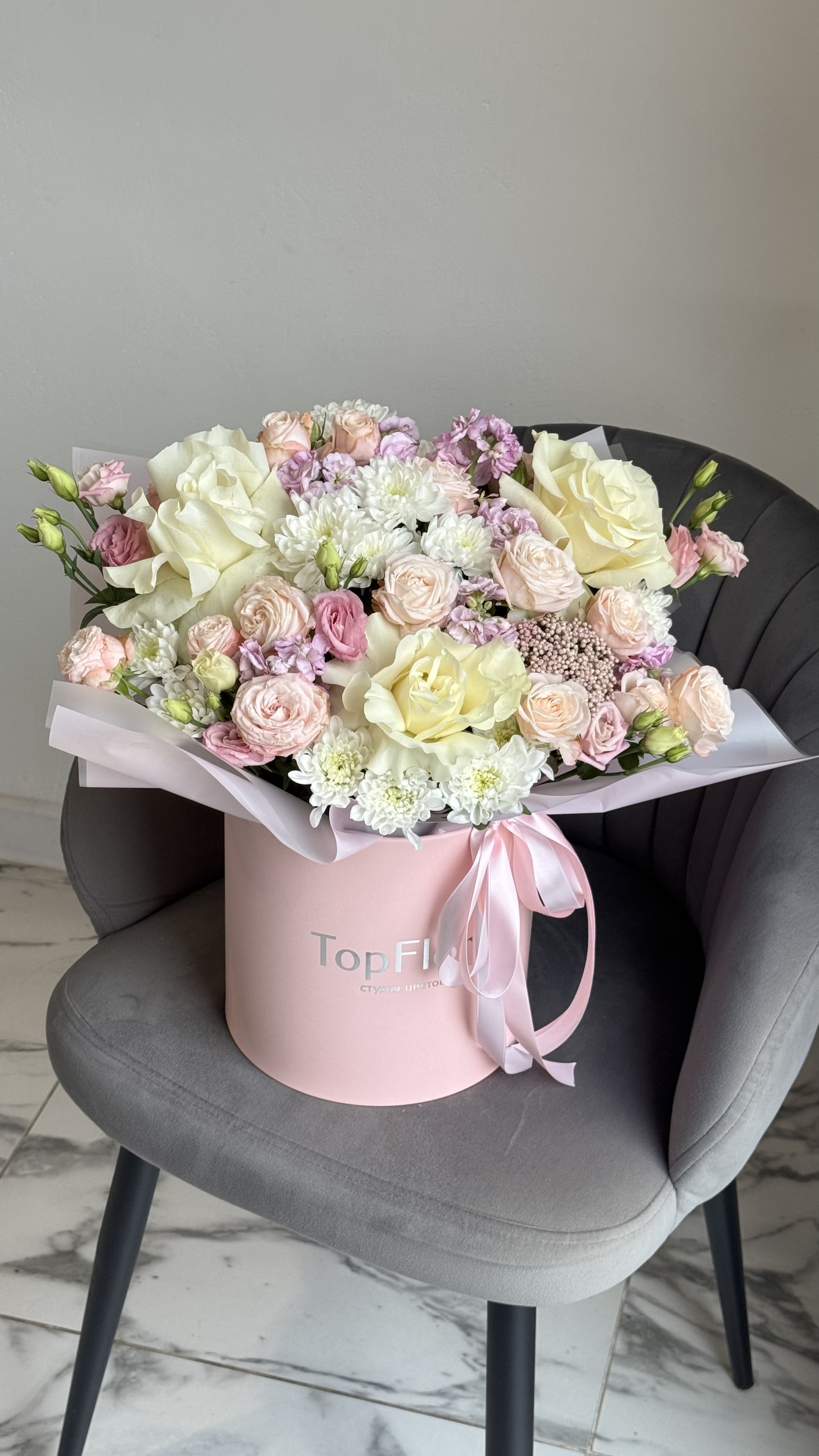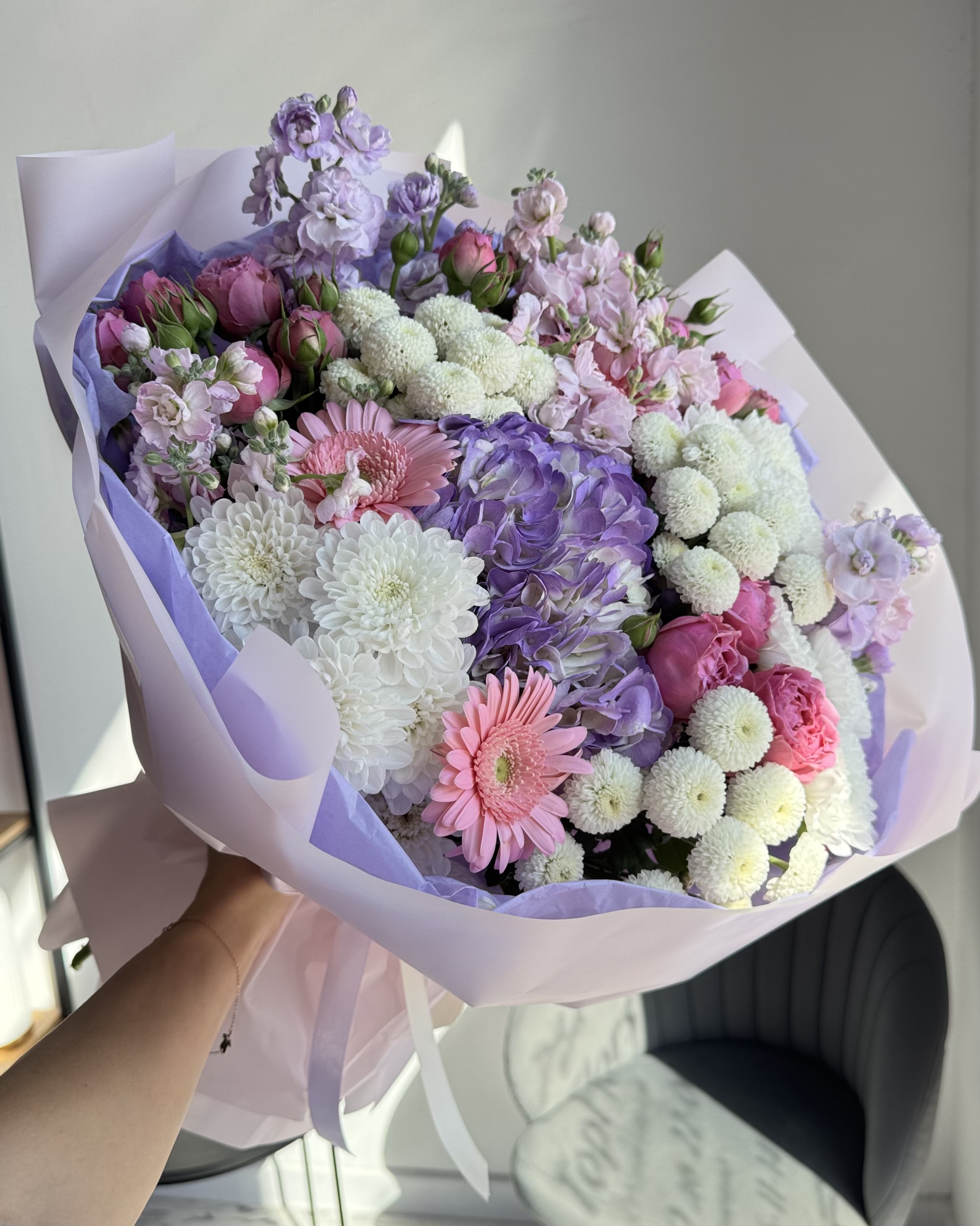 Гармония пастельных тонов, воплощенная в цветах. Лавандовые ноты придают букету утонченность, белые бутоны - свежесть, а розовые акценты добавляют тёплого сияния. Букет словно шепчет о нежности и безмятежности.