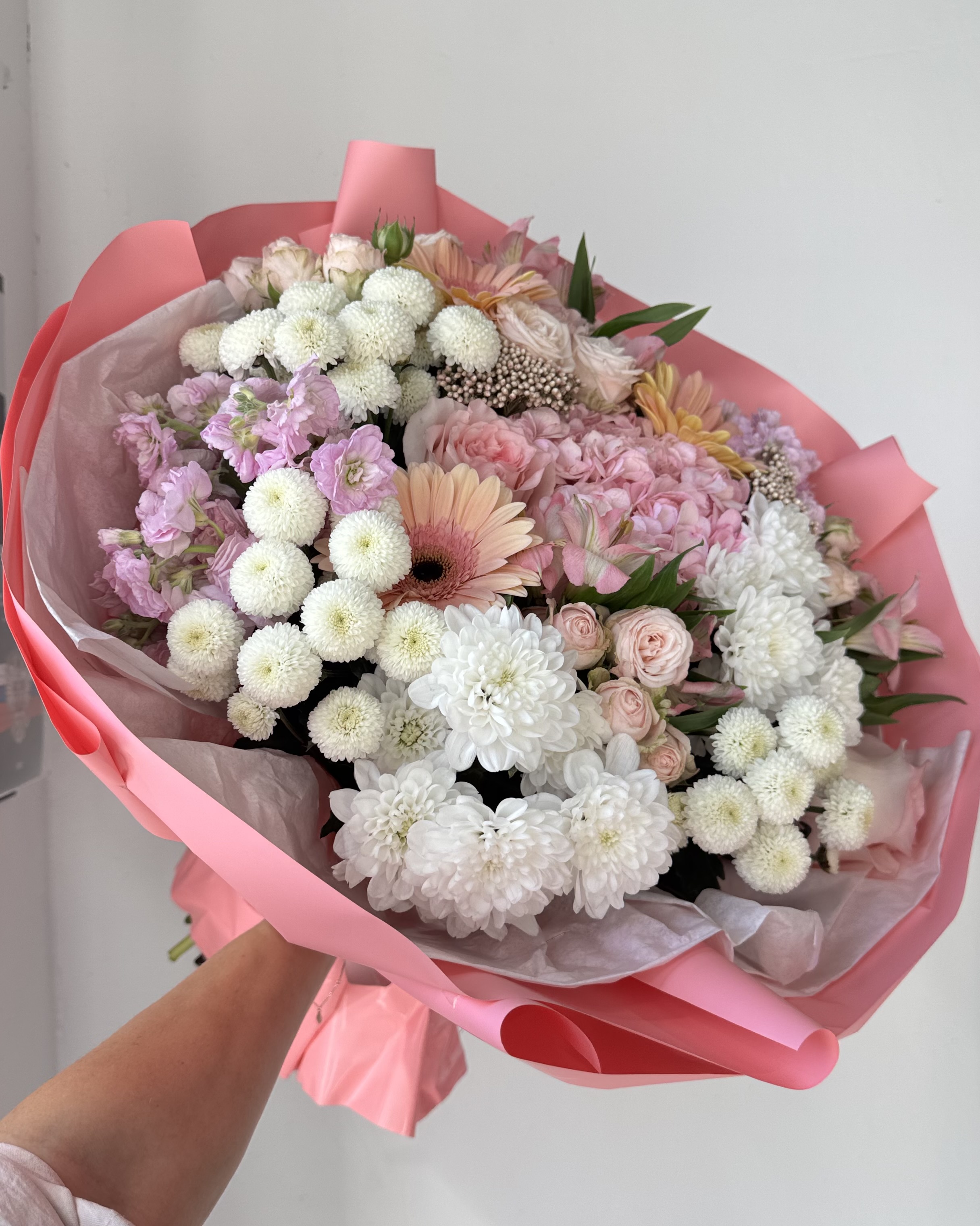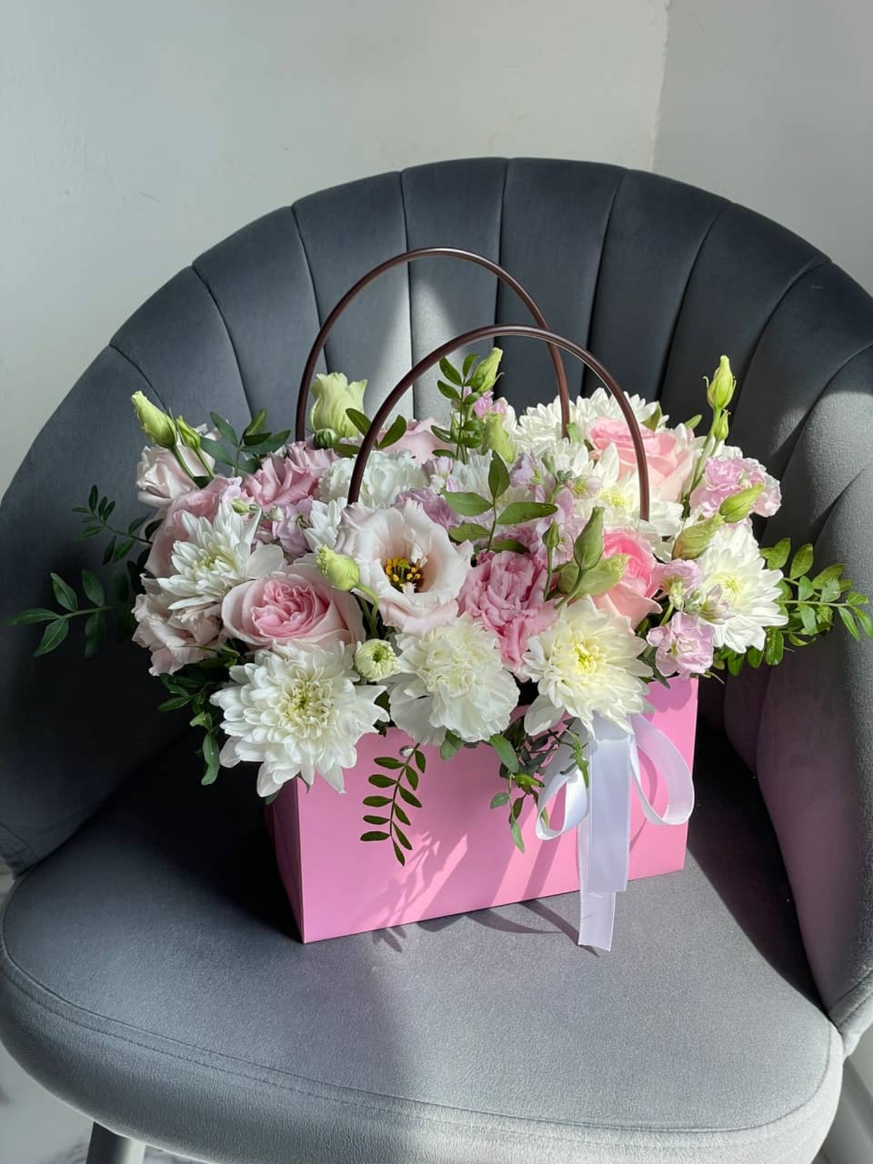 Розовые и белые оттенки цветов, собранные в сумочку размера XL
