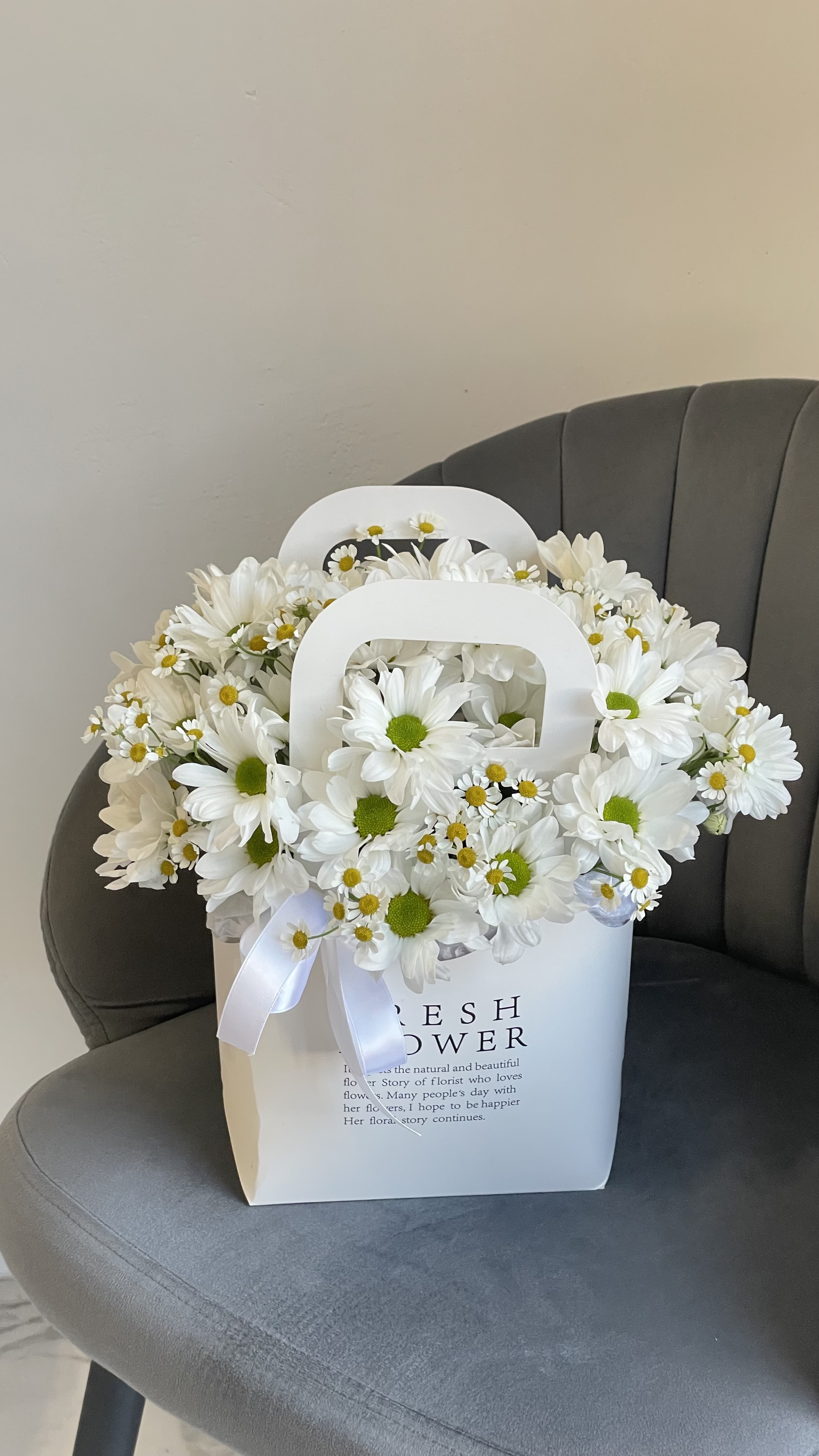 Белоснежная хризантема и ромашка в стильной сумочке.