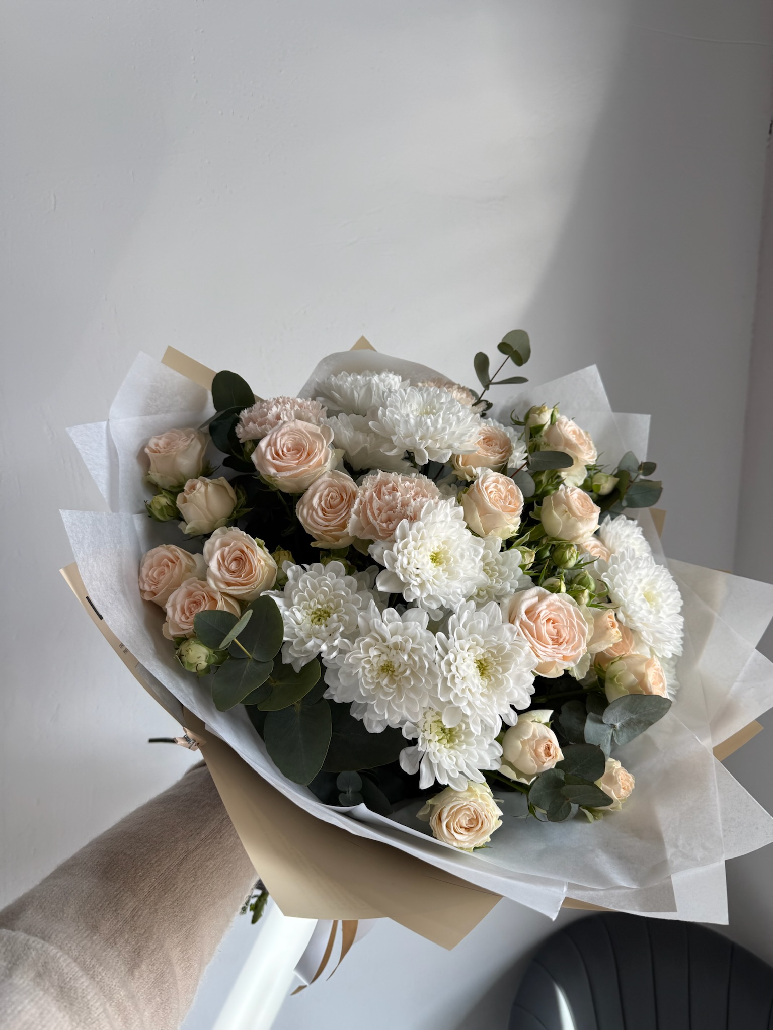 Легкий, как дыхание, букет из кремовых роз и хризантемы. Теплота и утонченность в каждой детали.